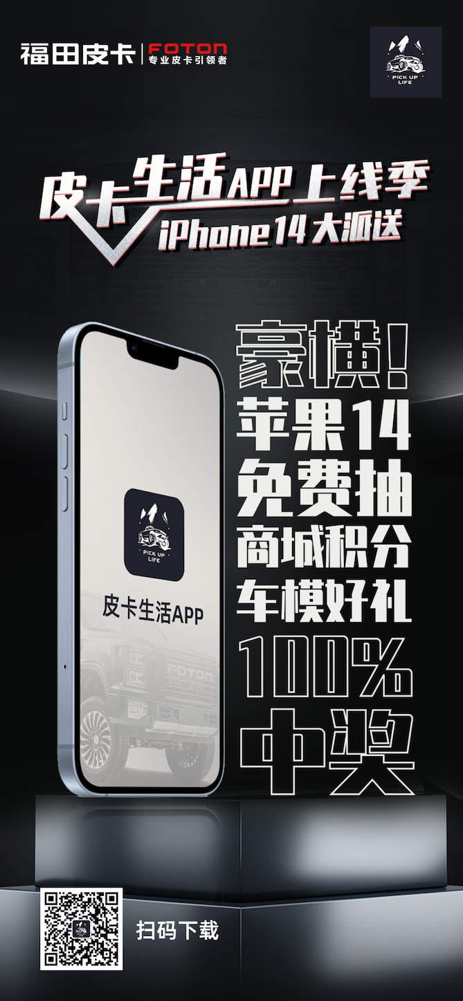 新用戶注冊“皮卡生活”APP,即可獲得一次幸運大轉盤抽獎機會,iphone14、車模、超值商城積分等驚喜派送,攜手萬千皮卡玩家,共同解鎖精彩皮卡生活,100%中獎率!心動不如行動,蘋果手機用戶在APP Store中搜索“皮卡生活”下載注冊;安卓類系統手機用戶通過掃描下方海報二維碼鏈接下載注冊 重磅豪禮等你來拿!