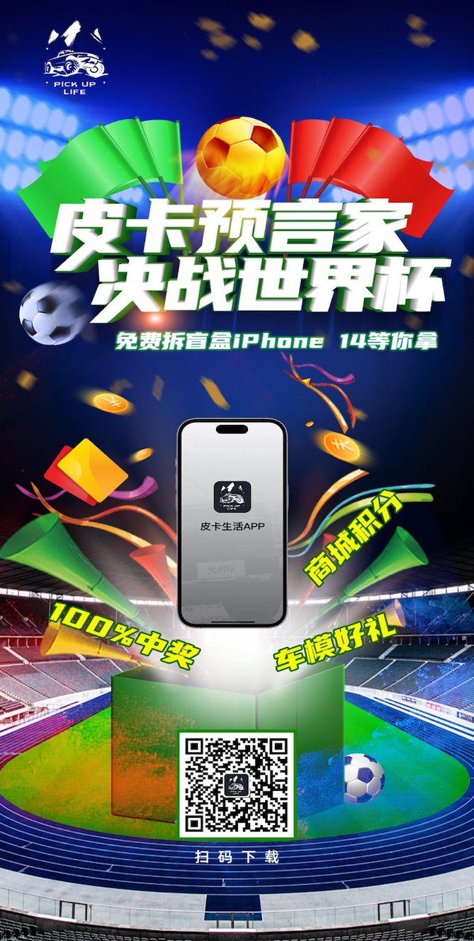 福田皮卡專為皮卡愛好者打造的專業溝通互動平臺——皮卡生活APP現已火熱上線,萬千皮卡玩家已匯集,來這里分享他們的故事,與皮卡大叔等行業大V交流改裝經驗,盡享一站式皮卡生活體驗。眼下正值四年一次的足球盛事,億萬球迷正迎來一場狂歡盛宴,為給熱愛足球的皮卡車友打造精彩的互動體驗,深度鏈合天南地北廣大皮卡愛好者,皮卡生活APP正開啟“我是預言帝”精彩競猜活動,邀您一起玩轉世界杯,參與優勝隊伍競猜,iphone14、車模、商城積分…多重好禮等你來拿,趕快參與吧!