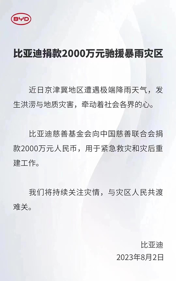 比亞迪向京津冀暴雨災(zāi)區(qū)捐款2000萬元