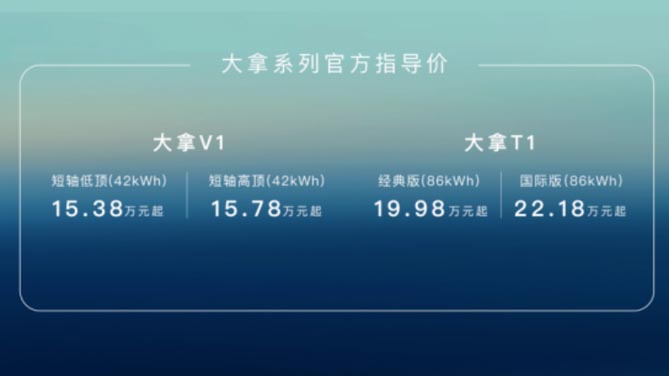 全新品牌已來,全新平臺也應運而生。上汽大通MAXUS“全球純電智慧輕型車架構平臺”MILA,將成為品牌開啟高品質新能源輕型車市場的問路之“玉”。面向全球市場和未來趨勢,上汽大通MAXUS基于該平臺打造的首款車型大拿V1、大拿T1同步震撼上市,以劃時代的“全維度創新”產品力刷新全球新能源輕型車“天花板”。大拿V1售價15.38萬元起;大拿T1售價19.98萬元起。雙車齊發,上汽大通MAXUS“大拿”助力用戶成為“面子大拿”和“賺錢大拿”、“省心大拿”和“財富大拿”。