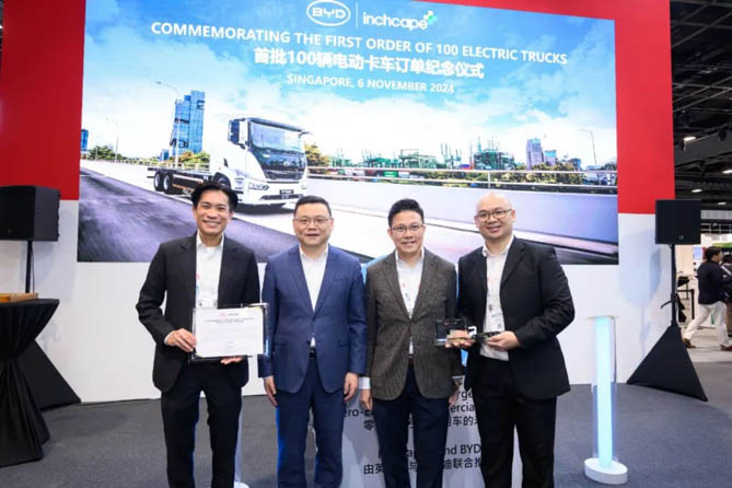 在現場,比亞迪還與Inchcape(經銷商)舉行首批100臺電動卡車T9R訂單紀念儀式,這是比亞迪在新加坡電動重卡的最大單筆訂單,車輛預計在2025年第二季度交付,助力新加坡政府的綠色計劃2030實現。