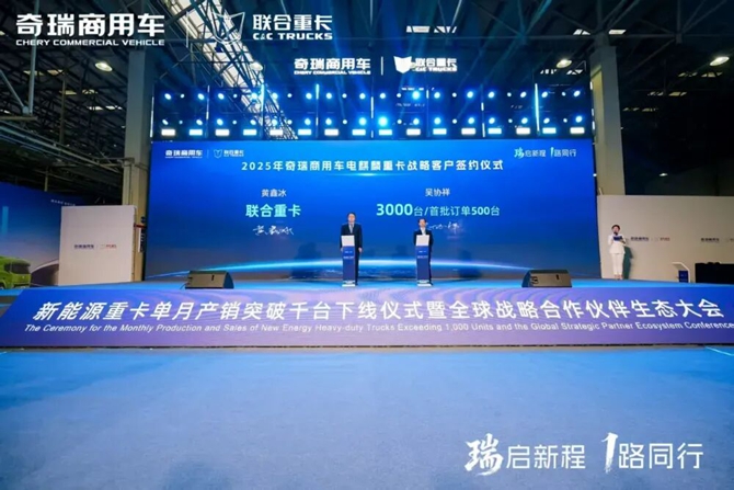 2025年11月7日,奇瑞商用車聯(lián)合重卡超級(jí)工廠內(nèi)光影璀璨、掌聲雷動(dòng),以“瑞啟新程1路同行”為主題的奇瑞商用車新能源重卡單月產(chǎn)銷突破千臺(tái)下線儀式暨全球戰(zhàn)略合作伙伴生態(tài)大會(huì)隆重舉行。奇瑞控股集團(tuán)董事長(zhǎng)尹同躍出席大會(huì)并作主旨演講。