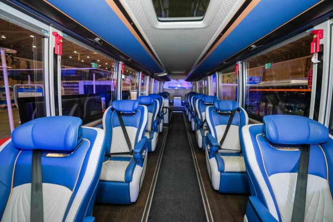 在高端化方面,宇通積極滿足美好出行的需求,推出了“金玉滿堂、青山碧水”等獲得市場認可的高端內飾產品,今年推出的全新高端車型宇通天域S12,更憑借102項專利技術刷新行業紀錄,推動客車行業的高端化進程不斷加速。