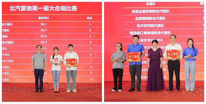 北汽雷馳聯合創始人、董事長張劍在致辭中表示,“圍繞國家雙碳戰略部署,商用車新能源化是大勢所趨,山東省更是走在了新能源汽車推廣的前列,北汽雷馳占盡天時、地利、人和,成為中國城市新能源物流車領跑者是北汽雷馳唯一的目標,也是必然的歸途。唯有踐行井岡山精神,才能從一個勝利走向另一個勝利。” 在陣陣掌聲和歡呼中,2023屆新入職的大學生帶來開場舞《相親相愛》,濃郁的青春氣息撲面而來,倍感振奮。 伴隨著激昂的音樂,周年慶典合唱比賽正式拉開序幕,來自不同業務單元的十支合唱隊伍用嘹亮的歌聲歌唱祖國、祝賀北汽雷馳。 制造技術安環設備聯合代表隊 制造部涂裝車間代表隊 制造部總裝車間代表隊 品牌營銷聯合代表隊 制造部沖壓車間代表隊 財務運營采購聯合代表隊 技術研究院代表隊 制造部焊裝車間代表隊 質量管理部代表隊 制造部訂單物流聯合代表隊