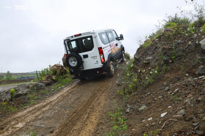老程:兩個字,驚艷!依維柯歐霸·山海讓我感受最深的地方,就是車子的越野能力特別驚艷。今天是泥地的狀態,因為3.0T的動力很足,像20°-30°的那種坡,用高速四驅就能上,然后稍微陡一些,加一些角度的時候,加一個中鎖,或者再加一個后鎖,完全沒有問題,如履平地。
