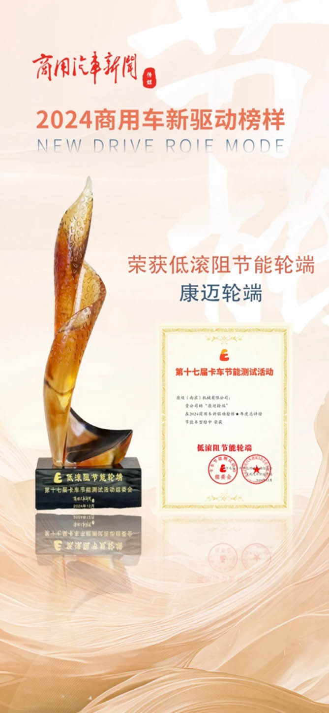 12月18日,由商用汽車新聞傳媒舉辦的“2024商用車新驅動榜樣峰會”在北京舉行。康邁輪端搭載在北京重卡LNG牽引車等整車產品上在第十七屆卡車節能測試活動中參與了測試,憑借優異的產品性能為參賽車輛提供了卓越的安全保障和節能助力,最終榮獲了“2024中國商用車低滾阻節油輪端”稱號。