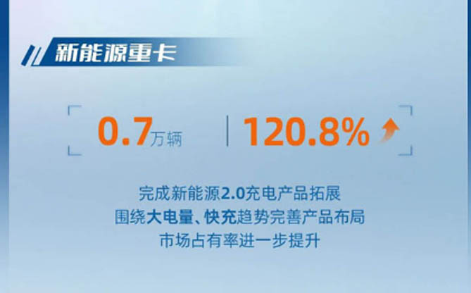 此外,公司圍繞大電量、快充趨勢完善整車產品布局,發布X5000E/M3000E 400kWh充換電、600kWh大電量充電等車型,完成新能源2.0充電產品拓展。報告期內,公司新能源重卡市場占有率進一步提升,銷量由3000輛增長至7000輛,同比增長120.8%;氫能源產品在多地商業化運營,銷量位居行業第一。