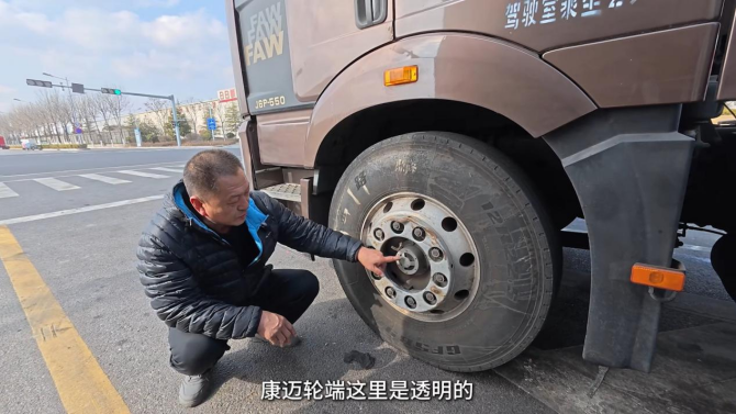 康邁輪端的可視化設計,能夠讓司機直觀地觀察到輪端內部的油量情況。紀師傅每次出車前,都會習慣性地檢查輪胎、鋼板螺絲和輪端油量。他提到:“以前普通輪端用潤滑脂,只能拆解檢查,費時費力。現在康邁輪端一眼就能看清油量,檢查更高效省事。”