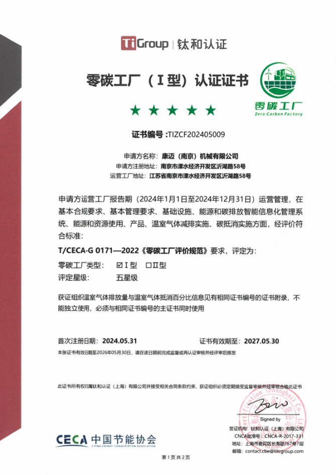 近日,康邁南京工廠成功獲得五星級I型零碳工廠認證,邁出綠色新突破。這不僅是繼2023年獲得四星級認證后的進一步提升,更是康邁持續深化碳減排、綠色制造的階段性成果,體現了康邁在綠色制造領域的持續優化與領先實踐。