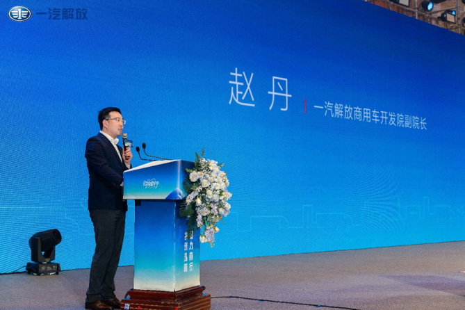 (一汽解放商用車開發院副院長趙丹先生發布“體系節油技術2.0”照片)