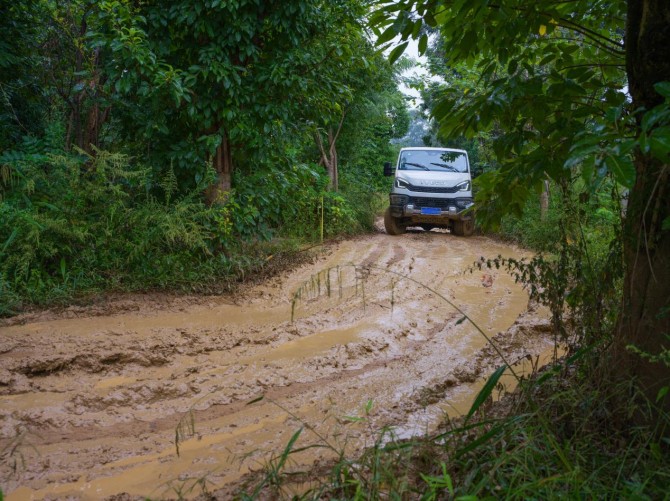 從雞窩坑脫困而出,經(jīng)過一段小樹林,就來到第二個關(guān)卡——交叉軸路段。對擁有全時四驅(qū)+三把鎖的依維柯歐霸·山海來說,想要通過這一關(guān),其實(shí)并不困難,只需在低速四驅(qū)模式下鎖止中央差速鎖,萬一遇到單側(cè)后輪打滑的情況也沒關(guān)系,只要啟用后橋差速鎖,讓兩個后輪同步轉(zhuǎn)動,獲得相同扭矩,?一樣可以輕松脫困。