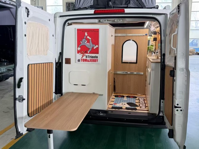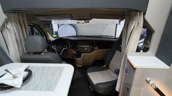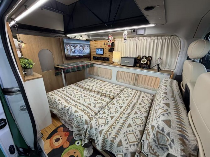 內飾空間設計兼顧實用性與舒適性,整車配備142L房車專用大容量冰箱,可長期儲備生鮮食材、飲品零食,戶外生活也能盡享新鮮美味;車內打造一體化餐廚區,集成吸油煙機、隱藏式洗菜盆、多功能控制區,搭配豐富儲物柜與置物架,讓戶外生活告別雜亂,便捷有序。空間靈活性方面,車型采用一物兩用的會客卡座設計,白天可作為休閑交流、辦公創作、間,夜晚通過伸縮擴展即可變身舒適大床,收納不占額外空間,兼顧休閑、住宿、儲物多重功能,完美適配情侶出行、家庭旅居、好友結伴等多場景需求。