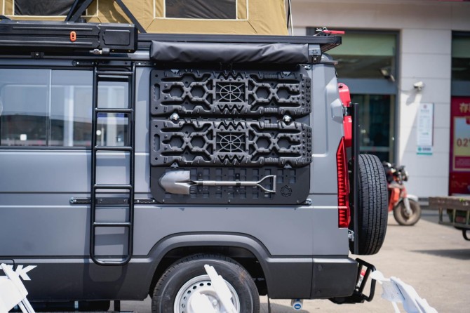 活動現場展示的得意8AT宿營車,最吸睛的莫過于其酷炫外觀——加裝的越野前后保險杠與側踏板彰顯力量感,側邊工具板可靈活搭載工具。車內保留2+3標準座椅布局,打通車頂并配備升頂帳篷,輕松滿足多人出行的需求。