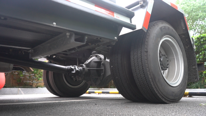 該車型的最大亮點(diǎn)在于其“可下地庫”與“雙胎”設(shè)計(jì)。憑借僅2100mm的外部高度,它可以輕松進(jìn)入絕大多數(shù)標(biāo)準(zhǔn)限高的地下停車場,解決了裝修垃圾清運(yùn)“最后一公里”的難題。動(dòng)力上,搭載云內(nèi)160馬力發(fā)動(dòng)機(jī)與最大27.64kW·h電池,配合帶爬坡檔的6檔自動(dòng)變速箱,確保在純電模式下安靜進(jìn)出小區(qū),在混動(dòng)模式下又能輕松應(yīng)對滿載爬坡。3360mm短軸距保證了靈活性,而1093鑄造橋(6.833速比)和高強(qiáng)度車架提供了強(qiáng)大的承載基礎(chǔ),使其成為名副其實(shí)的地庫清運(yùn)多能手。