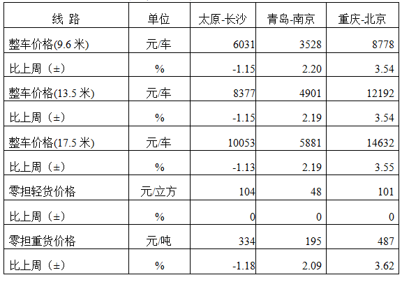 表1 本周部分線路平均價格及環(huán)比情況對比