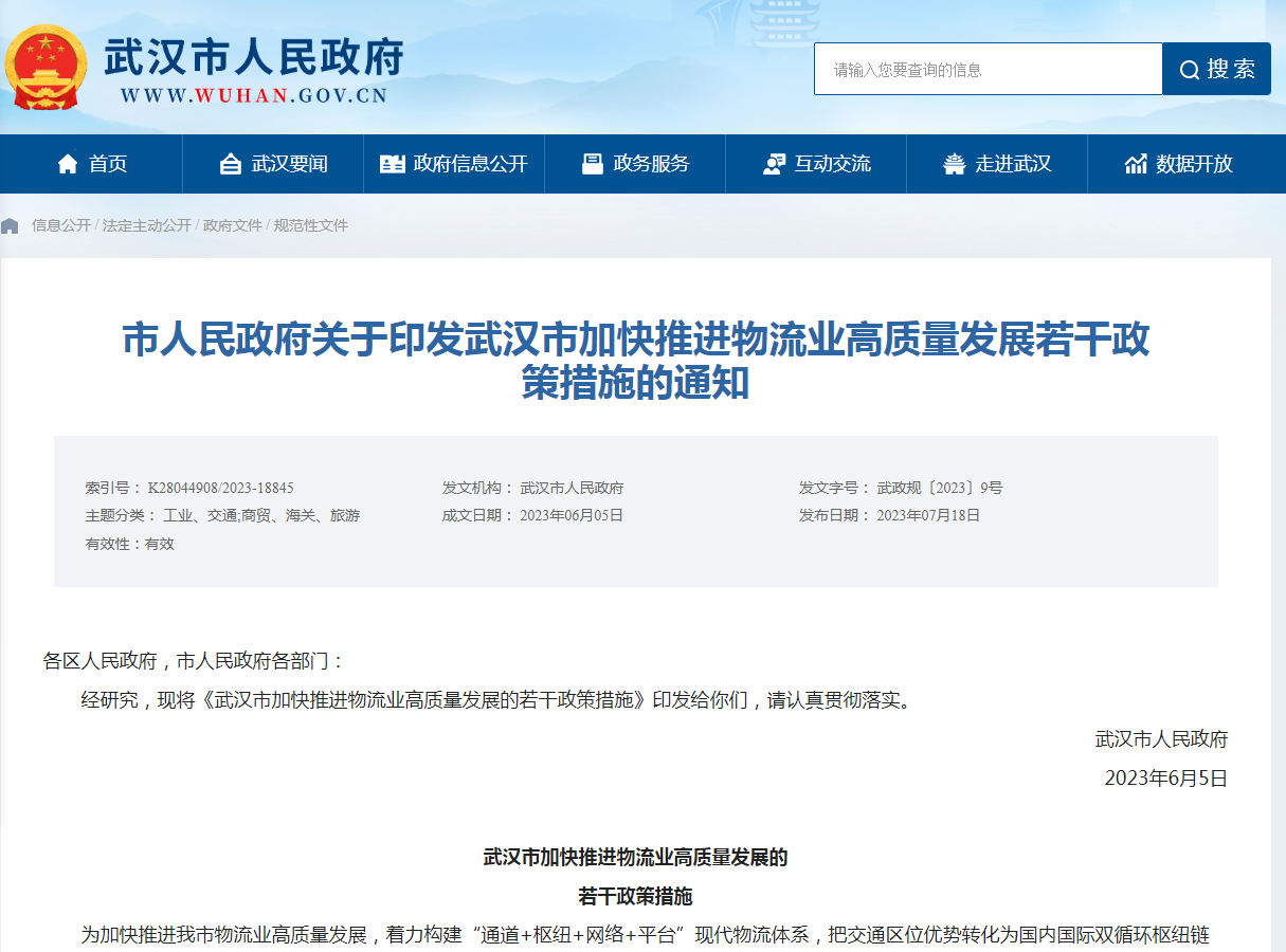 7月18日,武漢市人民政府印發《武漢市加快推進物流業高質量發展的若干政策措施》(簡稱《措施》),旨在加快推進武漢市物流業高質量發展,著力構建“通道+樞紐+網絡+平臺”現代物流體系,把交通區位優勢轉化為國內國際雙循環樞紐鏈接優勢。