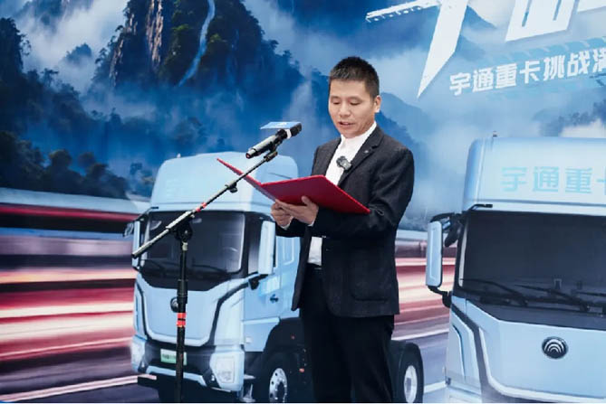 活動現場,中汽兄弟副總經理、中汽卡車兄弟俱樂部創始人楊金國宣讀并公布了宇通重卡此次挑戰的亮眼成績。楊金國表示:“此次我們中國商用車綜合性能測試組委會聯合宇通重卡開展純電重卡性能測試,旨在為中國商用車行業及廣大卡友提供更多優秀產品認證,經過前期對宇通重卡的高溫、高寒、節能、續航測試以及今天的復雜山路測試,我們見證了宇通重卡卓越的產品實力和優秀的性能表現。尤其是今天宇通重卡攀爬海拔落差達到400米、平均坡度10%的獐子崖盤山路挑戰,根據國家公路技術規范資料顯示,城市社會道路坡度在3%-6%,超過8%即被視為陡坡,可以說是宇通重卡此次挑戰超過了社會道路的坡度極限。”