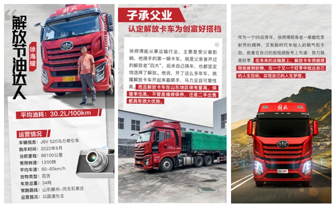 徐海耀是解放品牌的忠實(shí)粉絲,95后的他接觸的第一輛卡車是父親曾經(jīng)開過(guò)的老“四大”,因?yàn)橛H身體驗(yàn)過(guò)解放車的品質(zhì),所以自己從事貨運(yùn)時(shí),他堅(jiān)定地選擇了解放車。2022年8月,他購(gòu)買了屬于自己的第一輛卡車——J6V 520馬力牽引車。他說(shuō):“購(gòu)買解放的原因就是油耗低、性能靠譜。我現(xiàn)在跑物流專線,往返山東、河北兩地,這輛J6V開著相當(dāng)順手,馬力特別足,爬坡不費(fèi)勁,重點(diǎn)是油耗超出預(yù)期,百公里油耗30.2L左右,我特別滿意。”徐師傅還熱情地分享他的節(jié)油技巧:“因?yàn)檐囕v是大馬力、小速比,所以跑高速起步時(shí)可以大油門提速,速度上來(lái)后,把油門開度穩(wěn)在30%左右。但下坡時(shí)要穩(wěn)住油門,還要預(yù)判駕駛,減少剎車次數(shù)。”他介紹解放車在山東地區(qū)很受歡迎,不論維修保養(yǎng),還是二手車置換,都有很大優(yōu)勢(shì)。他說(shuō):“很高興能與解放結(jié)緣,也希望解放能生產(chǎn)更多好車,讓老百姓多賺錢。”